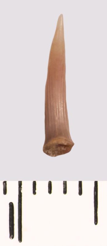 Зуб (фрагмент). Акула. Scapanorhynchus raphiodon (Agassiz, 1843). Классификация: Хордовые Chordata, Позвоночные Vertebrata, Хрящевые рыбы Chondrichthyes, Пластиножаберные Elasmobranchii, Акулы Selachii, Ламнообразные Lamniformes
