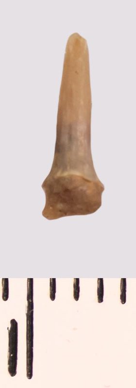 Зуб (фрагмент). Акула. Scapanorhynchus raphiodon (Agassiz, 1843). Классификация: Хордовые Chordata, Позвоночные Vertebrata, Хрящевые рыбы Chondrichthyes, Пластиножаберные Elasmobranchii, Акулы Selachii, Ламнообразные Lamniformes