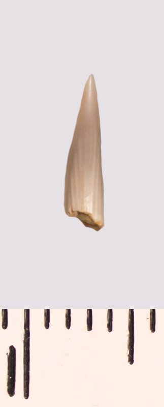 Зуб (фрагмент). Акула. Scapanorhynchus raphiodon (Agassiz, 1843). Классификация: Хордовые Chordata, Позвоночные Vertebrata, Хрящевые рыбы Chondrichthyes, Пластиножаберные Elasmobranchii, Акулы Selachii, Ламнообразные Lamniformes