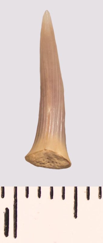 Зуб (фрагмент). Акула. Scapanorhynchus raphiodon (Agassiz, 1843). Классификация: Хордовые Chordata, Позвоночные Vertebrata, Хрящевые рыбы Chondrichthyes, Пластиножаберные Elasmobranchii, Акулы Selachii, Ламнообразные Lamniformes