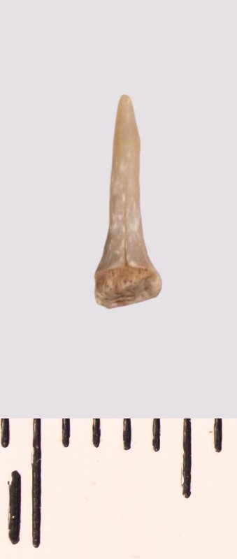 Зуб (фрагмент). Акула. Scapanorhynchus raphiodon (Agassiz, 1843). Классификация: Хордовые Chordata, Позвоночные Vertebrata, Хрящевые рыбы Chondrichthyes, Пластиножаберные Elasmobranchii, Акулы Selachii, Ламнообразные Lamniformes