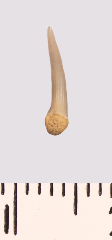 Зуб (фрагмент). Акула. Scapanorhynchus raphiodon (Agassiz, 1843). Классификация: Хордовые Chordata, Позвоночные Vertebrata, Хрящевые рыбы Chondrichthyes, Пластиножаберные Elasmobranchii, Акулы Selachii, Ламнообразные Lamniformes