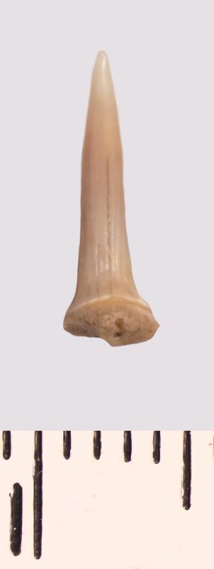 Зуб (фрагмент). Акула. Scapanorhynchus raphiodon (Agassiz, 1843). Классификация: Хордовые Chordata, Позвоночные Vertebrata, Хрящевые рыбы Chondrichthyes, Пластиножаберные Elasmobranchii, Акулы Selachii, Ламнообразные Lamniformes
