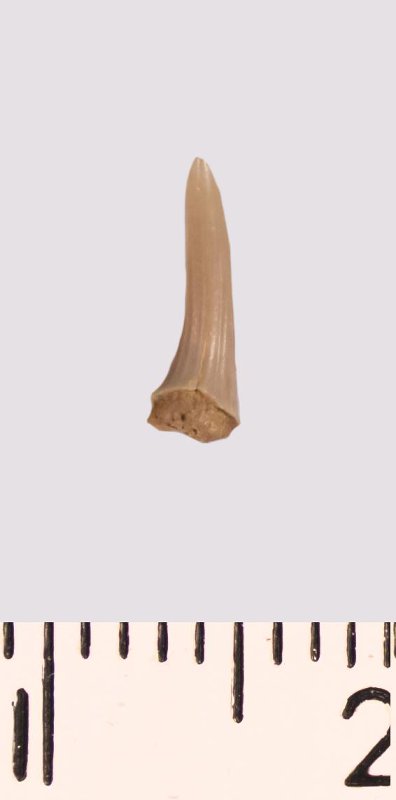 Зуб (фрагмент). Акула. Scapanorhynchus raphiodon (Agassiz, 1843). Классификация: Хордовые Chordata, Позвоночные Vertebrata, Хрящевые рыбы Chondrichthyes, Пластиножаберные Elasmobranchii, Акулы Selachii, Ламнообразные Lamniformes