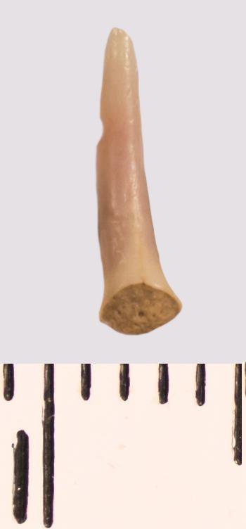 Зуб (фрагмент). Акула. Scapanorhynchus raphiodon (Agassiz, 1843). Классификация: Хордовые Chordata, Позвоночные Vertebrata, Хрящевые рыбы Chondrichthyes, Пластиножаберные Elasmobranchii, Акулы Selachii, Ламнообразные Lamniformes