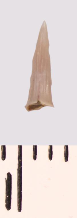 Зуб (фрагмент). Акула. Scapanorhynchus raphiodon (Agassiz, 1843). Классификация: Хордовые Chordata, Позвоночные Vertebrata, Хрящевые рыбы Chondrichthyes, Пластиножаберные Elasmobranchii, Акулы Selachii, Ламнообразные Lamniformes