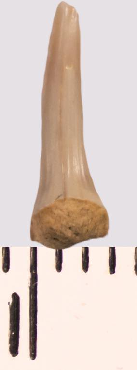 Зуб (фрагмент). Акула. Scapanorhynchus raphiodon (Agassiz, 1843). Классификация: Хордовые Chordata, Позвоночные Vertebrata, Хрящевые рыбы Chondrichthyes, Пластиножаберные Elasmobranchii, Акулы Selachii, Ламнообразные Lamniformes