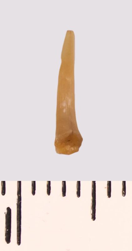 Зуб (фрагмент). Акула. Scapanorhynchus raphiodon (Agassiz, 1843). Классификация: Хордовые Chordata, Позвоночные Vertebrata, Хрящевые рыбы Chondrichthyes, Пластиножаберные Elasmobranchii, Акулы Selachii, Ламнообразные Lamniformes