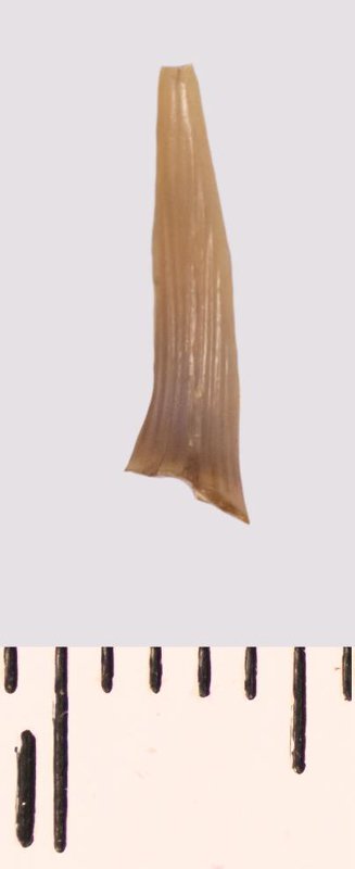 Зуб (фрагмент). Акула. Scapanorhynchus raphiodon (Agassiz, 1843). Классификация: Хордовые Chordata, Позвоночные Vertebrata, Хрящевые рыбы Chondrichthyes, Пластиножаберные Elasmobranchii, Акулы Selachii, Ламнообразные Lamniformes
