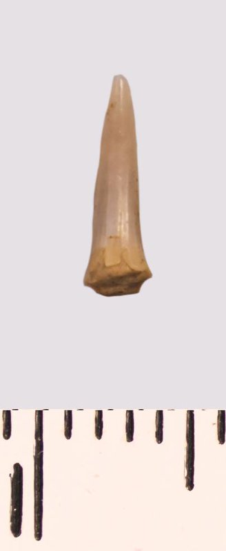 Зуб (фрагмент). Акула. Scapanorhynchus raphiodon (Agassiz, 1843). Классификация: Хордовые Chordata, Позвоночные Vertebrata, Хрящевые рыбы Chondrichthyes, Пластиножаберные Elasmobranchii, Акулы Selachii, Ламнообразные Lamniformes