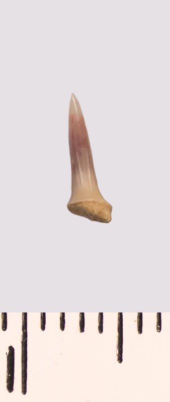 Зуб (фрагмент). Акула. Scapanorhynchus raphiodon (Agassiz, 1843). Классификация: Хордовые Chordata, Позвоночные Vertebrata, Хрящевые рыбы Chondrichthyes, Пластиножаберные Elasmobranchii, Акулы Selachii, Ламнообразные Lamniformes