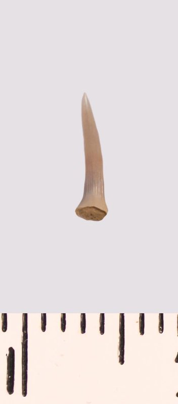 Зуб (фрагмент). Акула. Scapanorhynchus raphiodon (Agassiz, 1843). Классификация: Хордовые Chordata, Позвоночные Vertebrata, Хрящевые рыбы Chondrichthyes, Пластиножаберные Elasmobranchii, Акулы Selachii, Ламнообразные Lamniformes