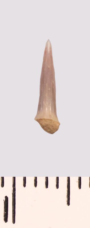 Зуб (фрагмент). Акула. Scapanorhynchus raphiodon (Agassiz, 1843). Классификация: Хордовые Chordata, Позвоночные Vertebrata, Хрящевые рыбы Chondrichthyes, Пластиножаберные Elasmobranchii, Акулы Selachii, Ламнообразные Lamniformes