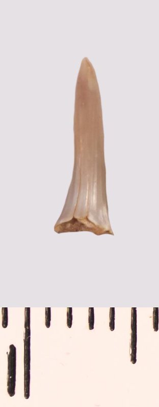 Зуб (фрагмент). Акула. Scapanorhynchus raphiodon (Agassiz, 1843). Классификация: Хордовые Chordata, Позвоночные Vertebrata, Хрящевые рыбы Chondrichthyes, Пластиножаберные Elasmobranchii, Акулы Selachii, Ламнообразные Lamniformes