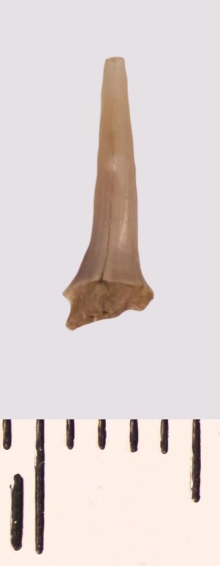 Зуб (фрагмент). Акула. Scapanorhynchus raphiodon (Agassiz, 1843). Классификация: Хордовые Chordata, Позвоночные Vertebrata, Хрящевые рыбы Chondrichthyes, Пластиножаберные Elasmobranchii, Акулы Selachii, Ламнообразные Lamniformes