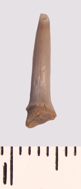 Зуб (фрагмент). Акула. Scapanorhynchus raphiodon (Agassiz, 1843). Классификация: Хордовые Chordata, Позвоночные Vertebrata, Хрящевые рыбы Chondrichthyes, Пластиножаберные Elasmobranchii, Акулы Selachii, Ламнообразные Lamniformes