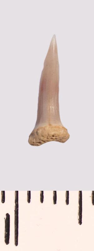 Зуб (фрагмент). Акула. Scapanorhynchus raphiodon (Agassiz, 1843). Классификация: Хордовые Chordata, Позвоночные Vertebrata, Хрящевые рыбы Chondrichthyes, Пластиножаберные Elasmobranchii, Акулы Selachii, Ламнообразные Lamniformes