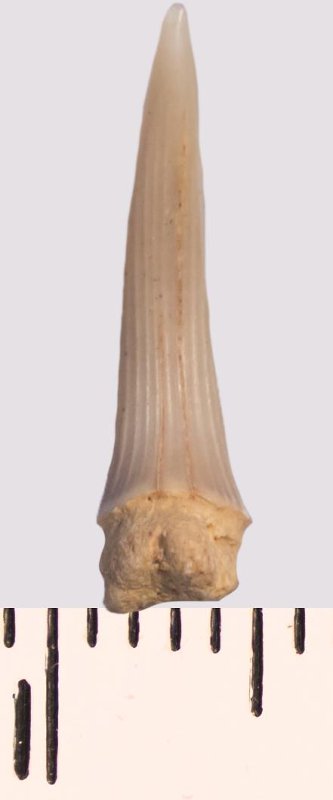 Зуб (фрагмент). Акула. Scapanorhynchus raphiodon (Agassiz, 1843). Классификация: Хордовые Chordata, Позвоночные Vertebrata, Хрящевые рыбы Chondrichthyes, Пластиножаберные Elasmobranchii, Акулы Selachii, Ламнообразные Lamniformes