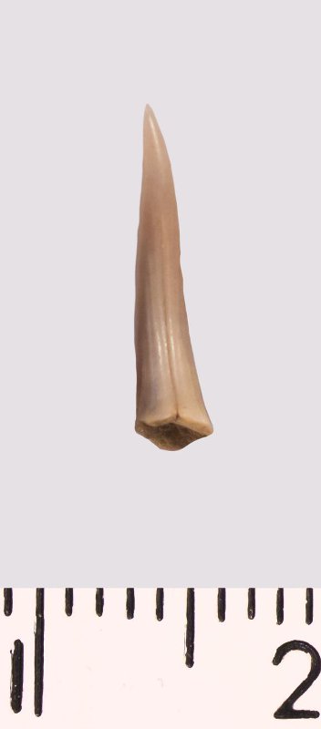 Зуб (фрагмент). Акула. Scapanorhynchus raphiodon (Agassiz, 1843). Классификация: Хордовые Chordata, Позвоночные Vertebrata, Хрящевые рыбы Chondrichthyes, Пластиножаберные Elasmobranchii, Акулы Selachii, Ламнообразные Lamniformes