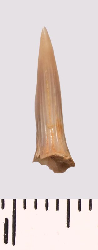Зуб (фрагмент). Акула. Scapanorhynchus raphiodon (Agassiz, 1843). Классификация: Хордовые Chordata, Позвоночные Vertebrata, Хрящевые рыбы Chondrichthyes, Пластиножаберные Elasmobranchii, Акулы Selachii, Ламнообразные Lamniformes
