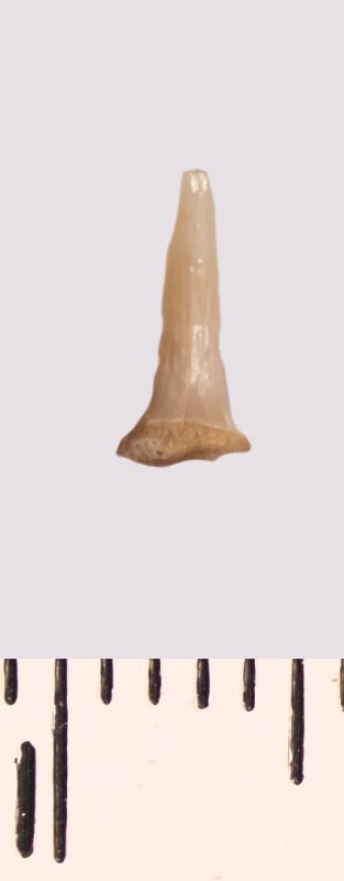 Зуб (фрагмент). Акула. Scapanorhynchus raphiodon (Agassiz, 1843). Классификация: Хордовые Chordata, Позвоночные Vertebrata, Хрящевые рыбы Chondrichthyes, Пластиножаберные Elasmobranchii, Акулы Selachii, Ламнообразные Lamniformes