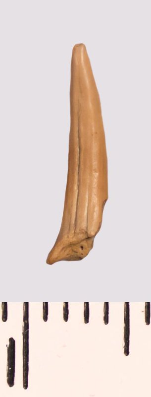 Зуб (фрагмент). Акула. Scapanorhynchus raphiodon (Agassiz, 1843). Классификация: Хордовые Chordata, Позвоночные Vertebrata, Хрящевые рыбы Chondrichthyes, Пластиножаберные Elasmobranchii, Акулы Selachii, Ламнообразные Lamniformes