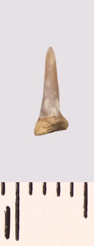 Зуб (фрагмент). Акула. Scapanorhynchus raphiodon (Agassiz, 1843). Классификация: Хордовые Chordata, Позвоночные Vertebrata, Хрящевые рыбы Chondrichthyes, Пластиножаберные Elasmobranchii, Акулы Selachii, Ламнообразные Lamniformes
