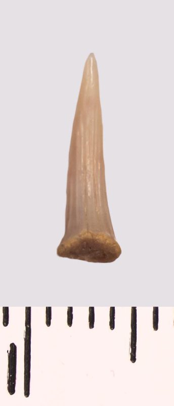 Зуб (фрагмент). Акула. Scapanorhynchus raphiodon (Agassiz, 1843). Классификация: Хордовые Chordata, Позвоночные Vertebrata, Хрящевые рыбы Chondrichthyes, Пластиножаберные Elasmobranchii, Акулы Selachii, Ламнообразные Lamniformes
