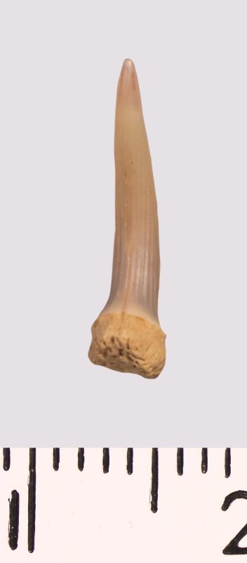 Зуб (фрагмент). Акула. Scapanorhynchus raphiodon (Agassiz, 1843). Классификация: Хордовые Chordata, Позвоночные Vertebrata, Хрящевые рыбы Chondrichthyes, Пластиножаберные Elasmobranchii, Акулы Selachii, Ламнообразные Lamniformes