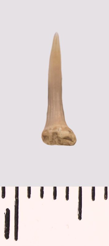 Зуб (фрагмент). Акула. Scapanorhynchus raphiodon (Agassiz, 1843). Классификация: Хордовые Chordata, Позвоночные Vertebrata, Хрящевые рыбы Chondrichthyes, Пластиножаберные Elasmobranchii, Акулы Selachii, Ламнообразные Lamniformes