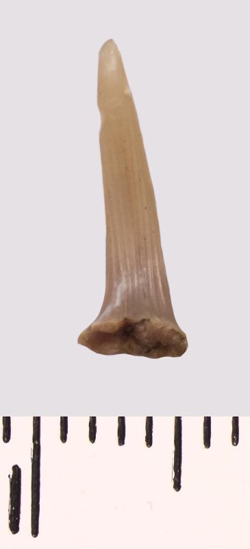 Зуб (фрагмент). Акула. Scapanorhynchus raphiodon (Agassiz, 1843). Классификация: Хордовые Chordata, Позвоночные Vertebrata, Хрящевые рыбы Chondrichthyes, Пластиножаберные Elasmobranchii, Акулы Selachii, Ламнообразные Lamniformes