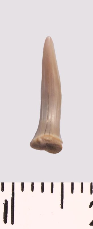 Зуб (фрагмент). Акула. Scapanorhynchus raphiodon (Agassiz, 1843). Классификация: Хордовые Chordata, Позвоночные Vertebrata, Хрящевые рыбы Chondrichthyes, Пластиножаберные Elasmobranchii, Акулы Selachii, Ламнообразные Lamniformes