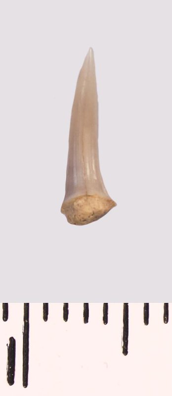 Зуб (фрагмент). Акула. Scapanorhynchus raphiodon (Agassiz, 1843). Классификация: Хордовые Chordata, Позвоночные Vertebrata, Хрящевые рыбы Chondrichthyes, Пластиножаберные Elasmobranchii, Акулы Selachii, Ламнообразные Lamniformes
