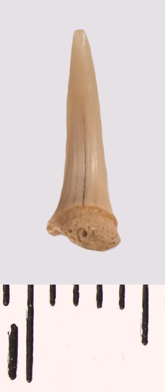 Зуб (фрагмент). Акула. Scapanorhynchus raphiodon (Agassiz, 1843). Классификация: Хордовые Chordata, Позвоночные Vertebrata, Хрящевые рыбы Chondrichthyes, Пластиножаберные Elasmobranchii, Акулы Selachii, Ламнообразные Lamniformes