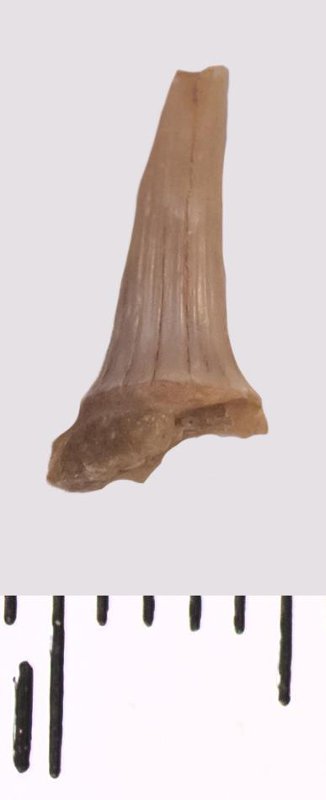 Зуб (фрагмент). Акула. Scapanorhynchus raphiodon (Agassiz, 1843). Классификация: Хордовые Chordata, Позвоночные Vertebrata, Хрящевые рыбы Chondrichthyes, Пластиножаберные Elasmobranchii, Акулы Selachii, Ламнообразные Lamniformes
