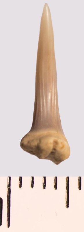 Зуб (фрагмент). Акула. Scapanorhynchus raphiodon (Agassiz, 1843). Классификация: Хордовые Chordata, Позвоночные Vertebrata, Хрящевые рыбы Chondrichthyes, Пластиножаберные Elasmobranchii, Акулы Selachii, Ламнообразные Lamniformes