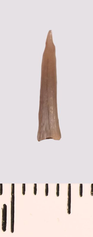 Зуб (фрагмент). Акула. Scapanorhynchus raphiodon (Agassiz, 1843). Классификация: Хордовые Chordata, Позвоночные Vertebrata, Хрящевые рыбы Chondrichthyes, Пластиножаберные Elasmobranchii, Акулы Selachii, Ламнообразные Lamniformes