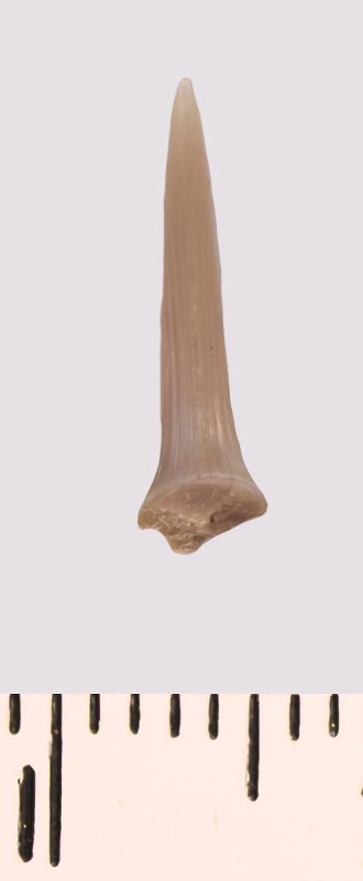Зуб (фрагмент). Акула. Scapanorhynchus raphiodon (Agassiz, 1843). Классификация: Хордовые Chordata, Позвоночные Vertebrata, Хрящевые рыбы Chondrichthyes, Пластиножаберные Elasmobranchii, Акулы Selachii, Ламнообразные Lamniformes