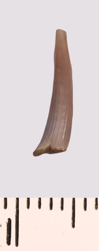 Зуб (фрагмент). Акула. Scapanorhynchus raphiodon (Agassiz, 1843). Классификация: Хордовые Chordata, Позвоночные Vertebrata, Хрящевые рыбы Chondrichthyes, Пластиножаберные Elasmobranchii, Акулы Selachii, Ламнообразные Lamniformes