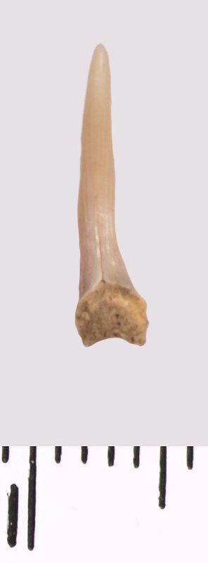 Зуб (фрагмент). Акула. Scapanorhynchus raphiodon (Agassiz, 1843). Классификация: Хордовые Chordata, Позвоночные Vertebrata, Хрящевые рыбы Chondrichthyes, Пластиножаберные Elasmobranchii, Акулы Selachii, Ламнообразные Lamniformes