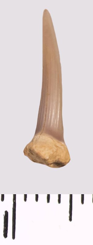 Зуб (фрагмент). Акула. Scapanorhynchus raphiodon (Agassiz, 1843). Классификация: Хордовые Chordata, Позвоночные Vertebrata, Хрящевые рыбы Chondrichthyes, Пластиножаберные Elasmobranchii, Акулы Selachii, Ламнообразные Lamniformes