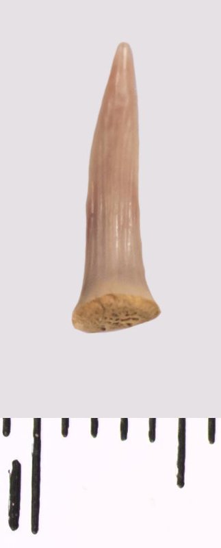 Зуб (фрагмент). Акула. Scapanorhynchus raphiodon (Agassiz, 1843). Классификация: Хордовые Chordata, Позвоночные Vertebrata, Хрящевые рыбы Chondrichthyes, Пластиножаберные Elasmobranchii, Акулы Selachii, Ламнообразные Lamniformes