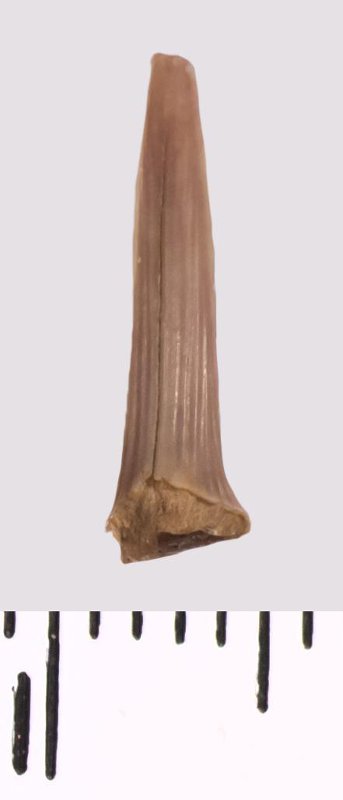 Зуб (фрагмент). Акула. Scapanorhynchus raphiodon (Agassiz, 1843). Классификация: Хордовые Chordata, Позвоночные Vertebrata, Хрящевые рыбы Chondrichthyes, Пластиножаберные Elasmobranchii, Акулы Selachii, Ламнообразные Lamniformes