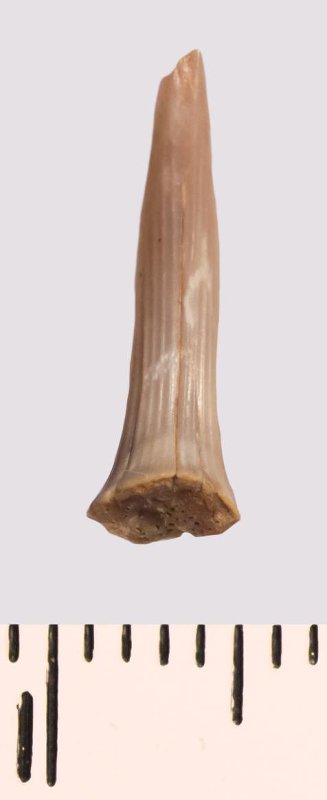 Зуб (фрагмент). Акула. Scapanorhynchus raphiodon (Agassiz, 1843). Классификация: Хордовые Chordata, Позвоночные Vertebrata, Хрящевые рыбы Chondrichthyes, Пластиножаберные Elasmobranchii, Акулы Selachii, Ламнообразные Lamniformes