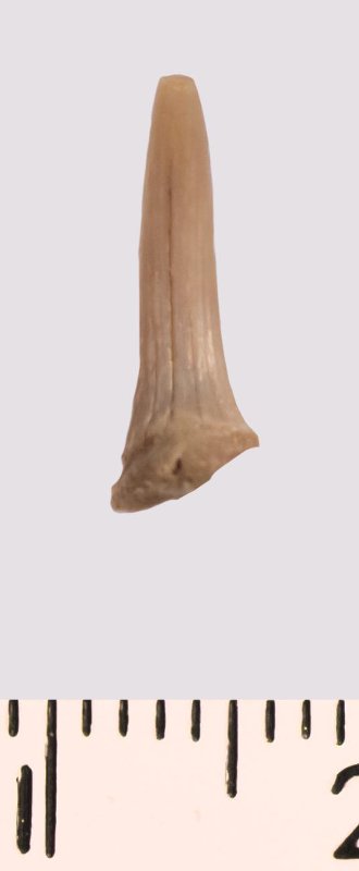 Зуб (фрагмент). Акула. Scapanorhynchus raphiodon (Agassiz, 1843). Классификация: Хордовые Chordata, Позвоночные Vertebrata, Хрящевые рыбы Chondrichthyes, Пластиножаберные Elasmobranchii, Акулы Selachii, Ламнообразные Lamniformes