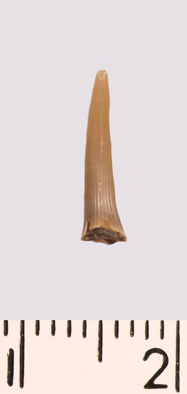 Зуб (фрагмент). Акула. Scapanorhynchus raphiodon (Agassiz, 1843). Классификация: Хордовые Chordata, Позвоночные Vertebrata, Хрящевые рыбы Chondrichthyes, Пластиножаберные Elasmobranchii, Акулы Selachii, Ламнообразные Lamniformes