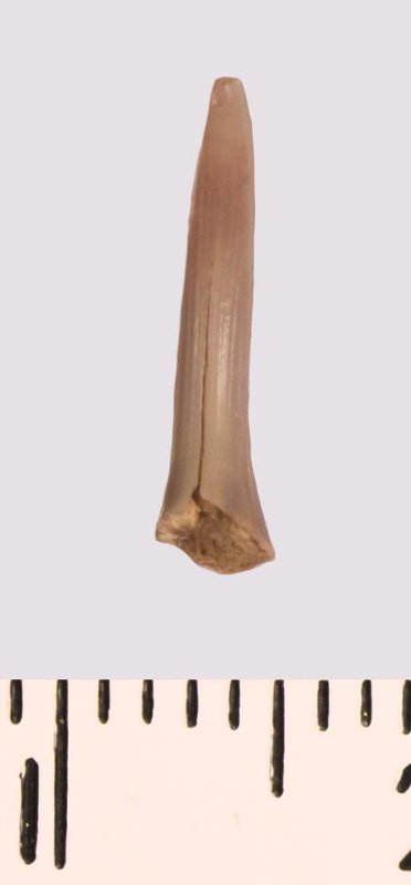 Зуб (фрагмент). Акула. Scapanorhynchus raphiodon (Agassiz, 1843). Классификация: Хордовые Chordata, Позвоночные Vertebrata, Хрящевые рыбы Chondrichthyes, Пластиножаберные Elasmobranchii, Акулы Selachii, Ламнообразные Lamniformes