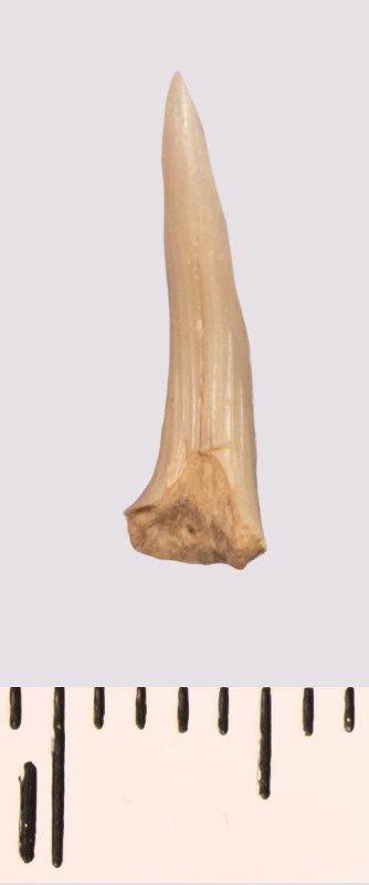 Зуб (фрагмент). Акула. Scapanorhynchus raphiodon (Agassiz, 1843). Классификация: Хордовые Chordata, Позвоночные Vertebrata, Хрящевые рыбы Chondrichthyes, Пластиножаберные Elasmobranchii, Акулы Selachii, Ламнообразные Lamniformes