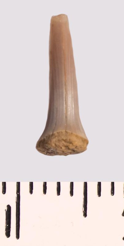 Зуб (фрагмент). Акула. Scapanorhynchus raphiodon (Agassiz, 1843). Классификация: Хордовые Chordata, Позвоночные Vertebrata, Хрящевые рыбы Chondrichthyes, Пластиножаберные Elasmobranchii, Акулы Selachii, Ламнообразные Lamniformes