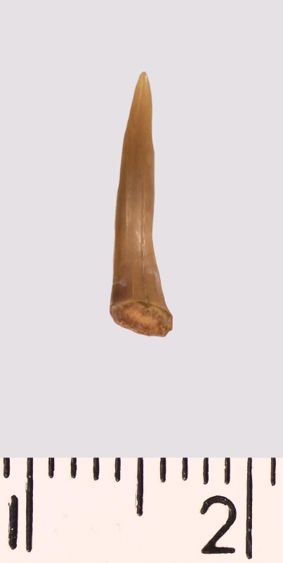 Зуб (фрагмент). Акула. Scapanorhynchus raphiodon (Agassiz, 1843). Классификация: Хордовые Chordata, Позвоночные Vertebrata, Хрящевые рыбы Chondrichthyes, Пластиножаберные Elasmobranchii, Акулы Selachii, Ламнообразные Lamniformes